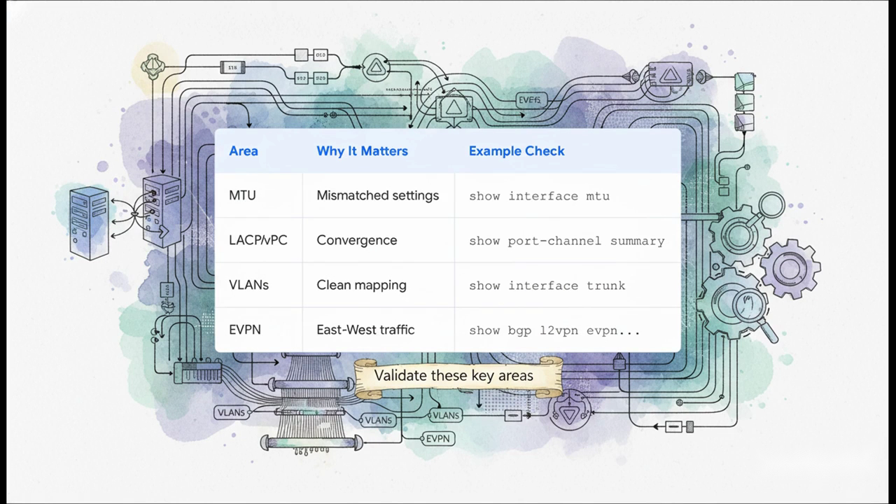 | LACP and vPC health | Node uplinks need deterministic convergence | show port-channel summary |